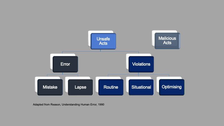 Reason’s interest in human error was piqued with the Chernobyl Nuclear disaster (April 1986) which was largely due to human actions. He developed a way of categorising unsafe acts. This is sometimes referred to as a ‘Just Culture’ Framework. It provides a useful tool for assessing individual versus organisational accountability and can enable a shift away from emotive and simplistic blame narratives.