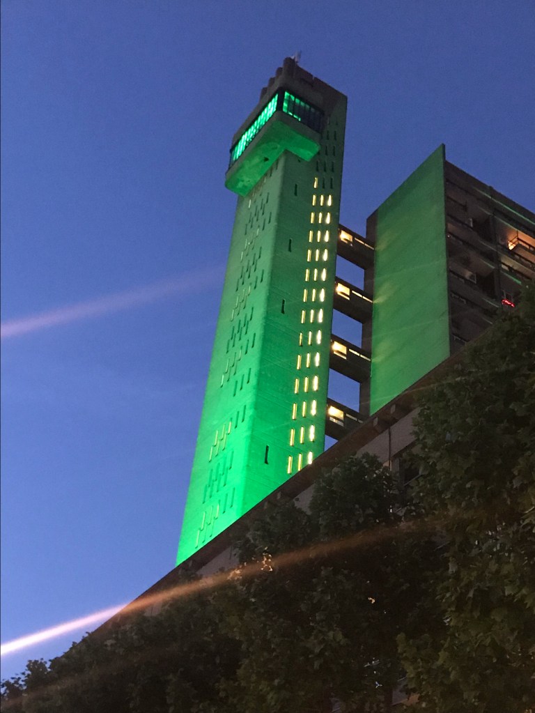 The night before the 2nd anniversary Grenfell United shone messages on unsafe buildings. Many buildings were lit in Green…