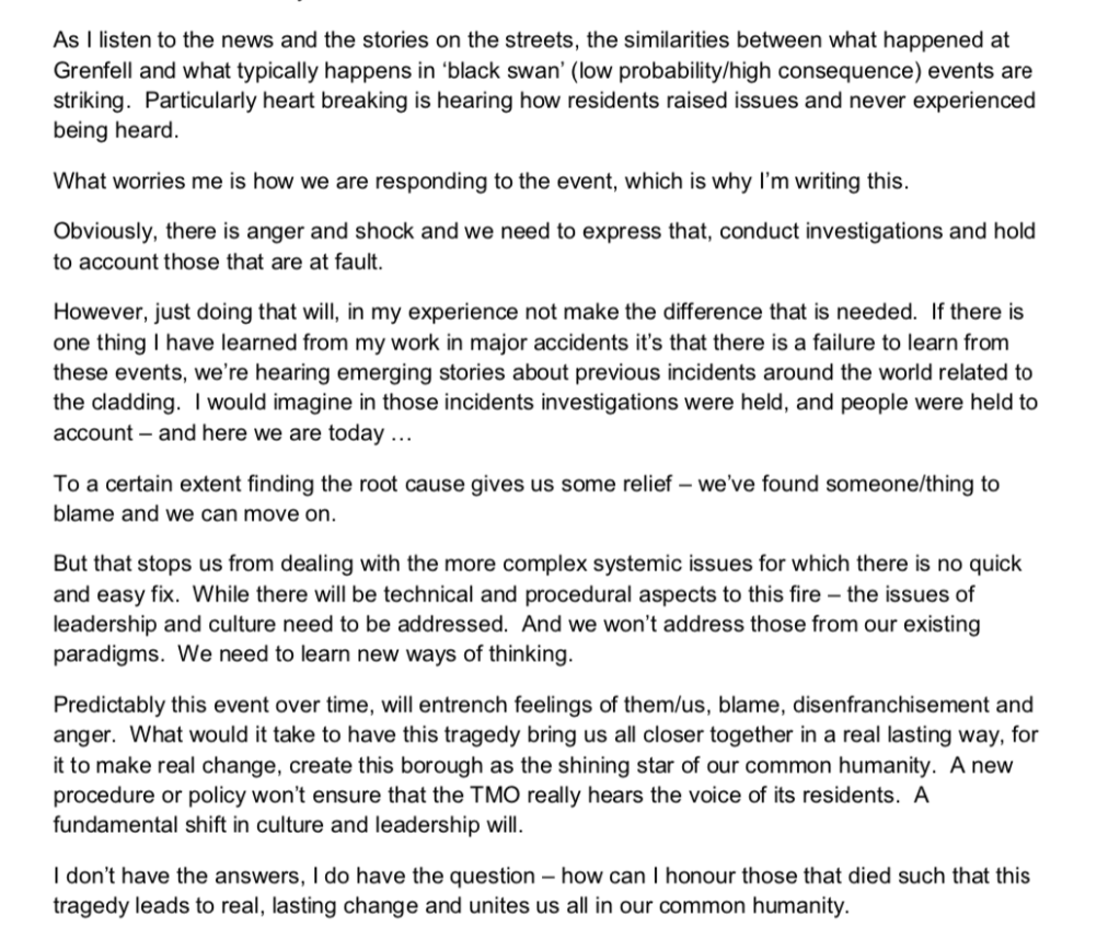 Professionally I partner organisations in high hazard industries to develop the leadership capability and culture to prevent catastrophic events such as the Grenfell Tower fire. As I watched the building burn, I vowed to do what it takes to ensure we learn and to make those lost lives, in some way, count.