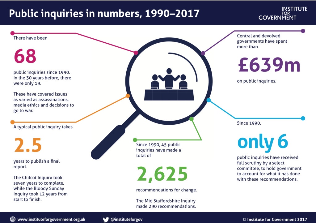 The Institute for Government’s report on how Inquiries can lead to change is a valuable resource. In the absence of a mechanism for swift and effective implementation of recommendations, I’ll be looking at what the Inquiry will do.