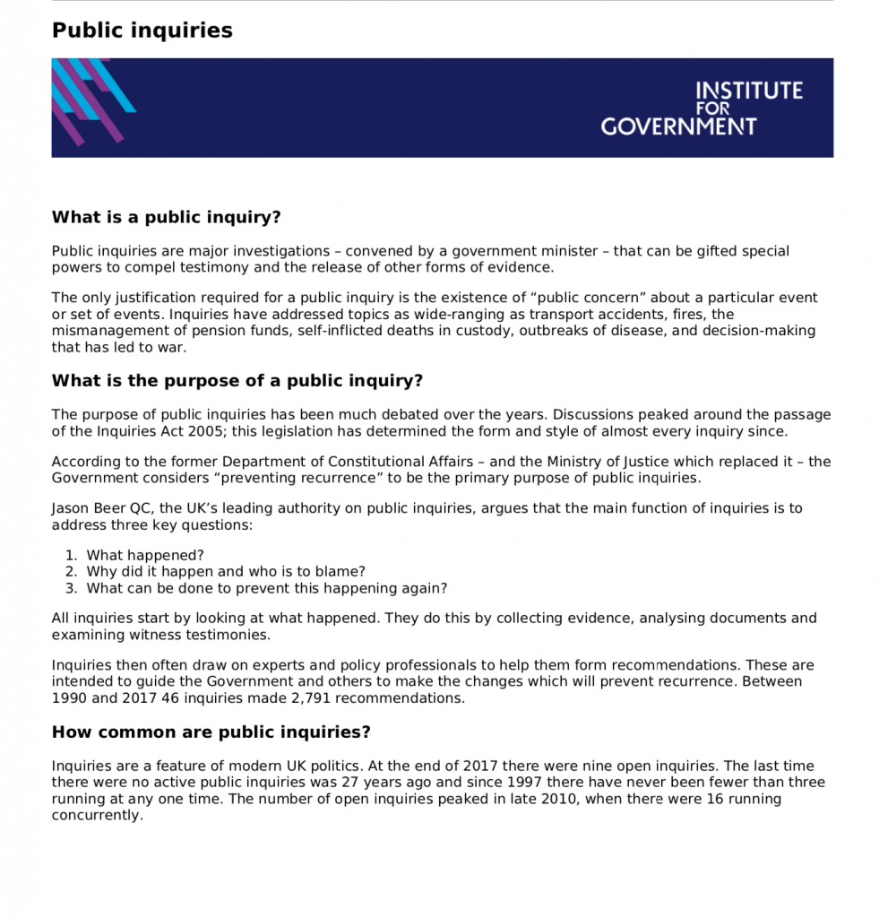 The Institute for Government provides a good summary of the purpose and intent of Public Inquiries.