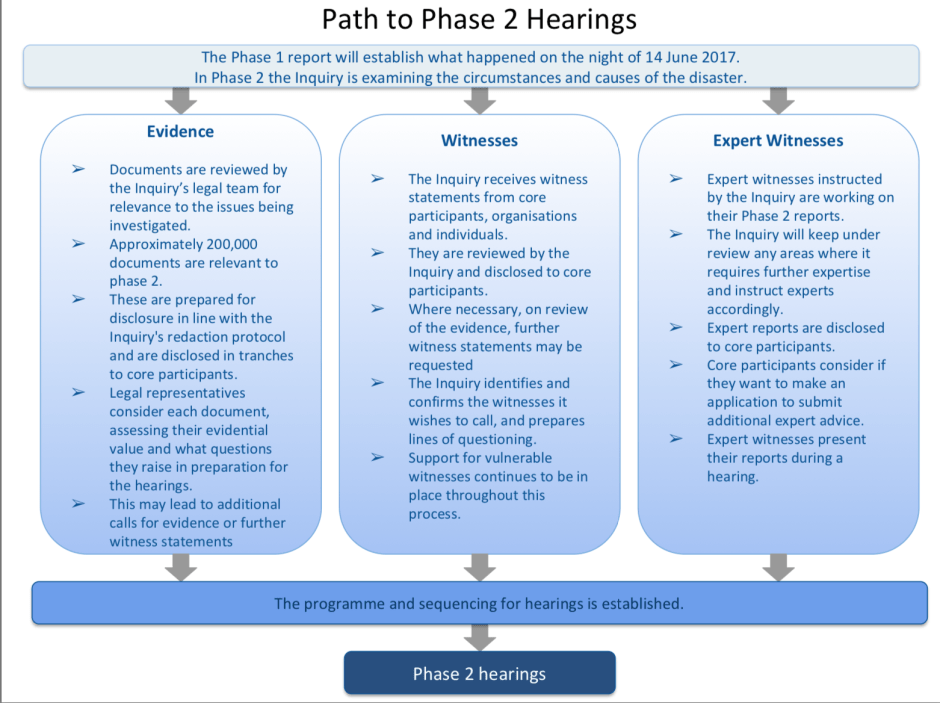 The inquiry is divided into 2 Phases. Phase 1 is limited to what happened on the night. Phase 2 will consider on ‘a broad front how the building came to be so seriously exposed to the risk of a disastrous fire.’