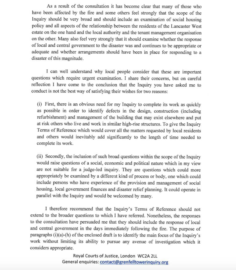 The Grenfell Tower Inquiry’s terms of reference were determined after a consultation process. Many think they are too narrow and should cover broader social and political issues. Sir Moore-Bick in his letter to the then Prime Minster Theresa May said: