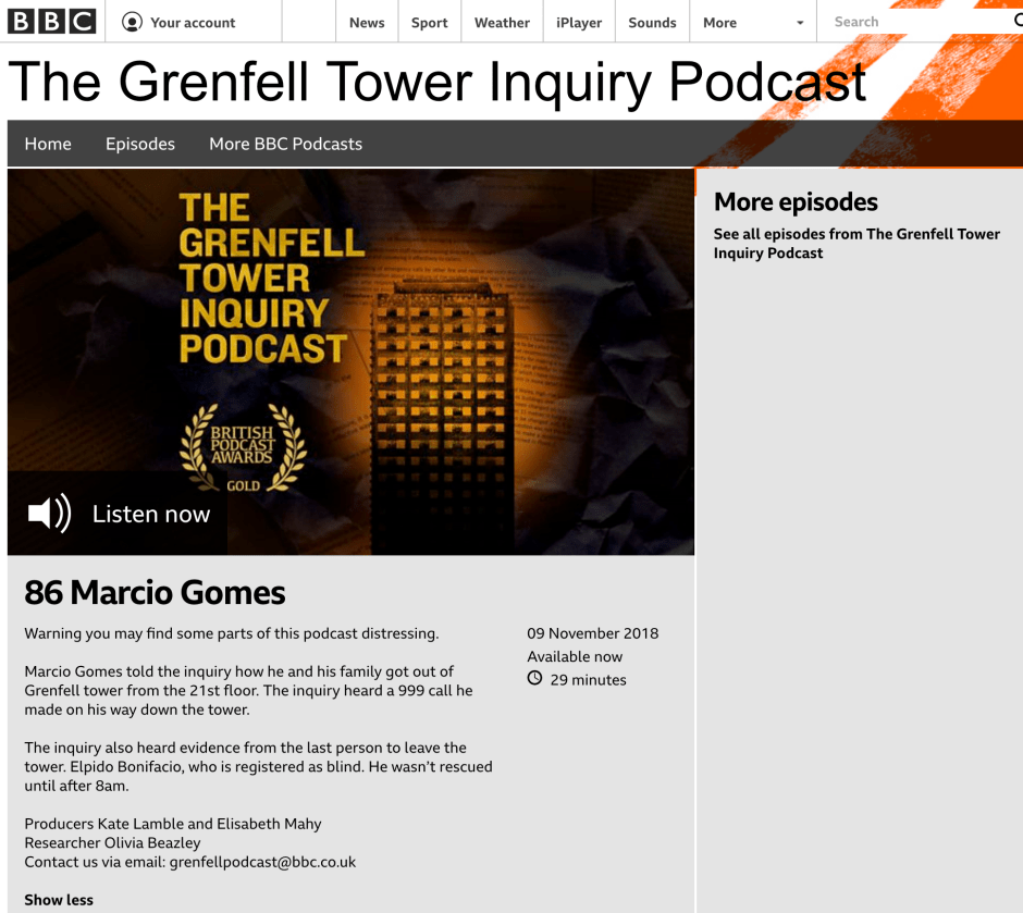 The following BBC Grenfell Inquiry Podcast shares Marcio Gomez’s testimony about his escape from the tower. Marcio was my neighbour on the 21st floor when we lived in Grenfell. His son, Logan Isaac, the youngest victim of the fire, was still born at seven months.