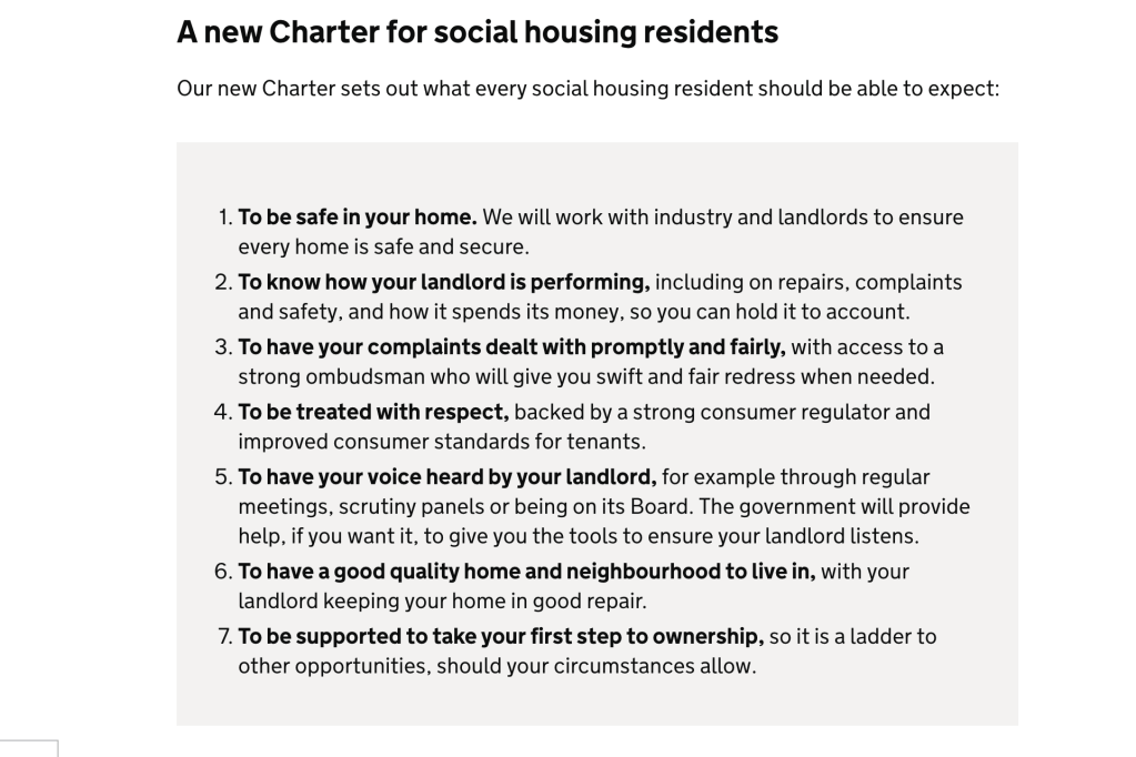 To the new charter for social housing residents (The 2021 Social Housing White Paper) that sets out what residents should expect.