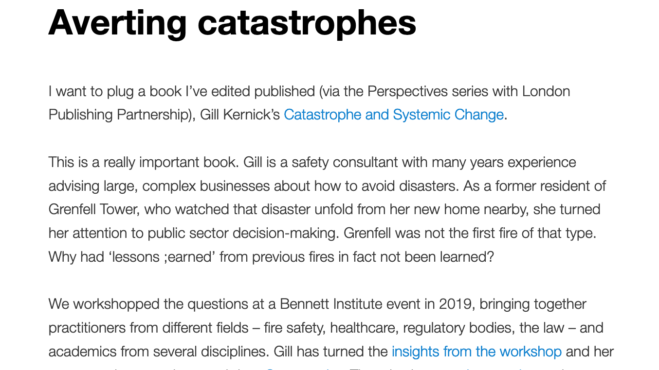 The Grenfell Tower tragedy was the worst residential fire in London since World War II. It killed seventy-two people in the richest borough of one of the wealthiest countries in the world. Like other catastrophic events before it and since, it has the power to bring about lasting change. But will it? The historical evidence is weighed against ‘lessons being learned’ in a meaningful or enduring way.